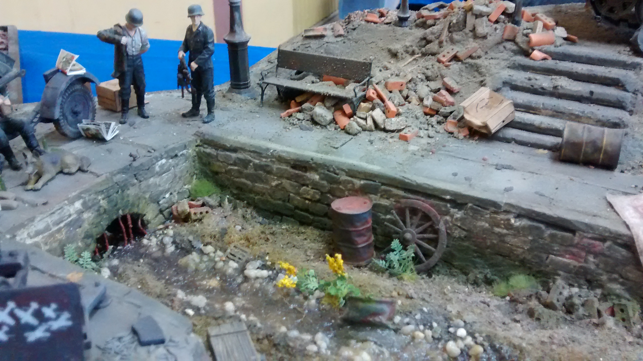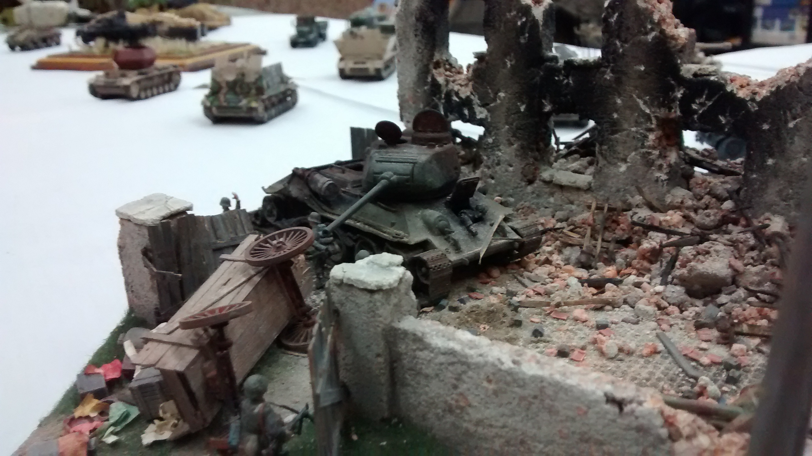Fast schon wie ein leibhaftiger Film mutete ein Diorama an, das einen T-34/85 und einen Lkw zeigt. Beide zerschossen inmitten einer hyperrealistischen Trümmerlandschaft. Soldaten und zivile Figuren sind am Rande sichtbar.