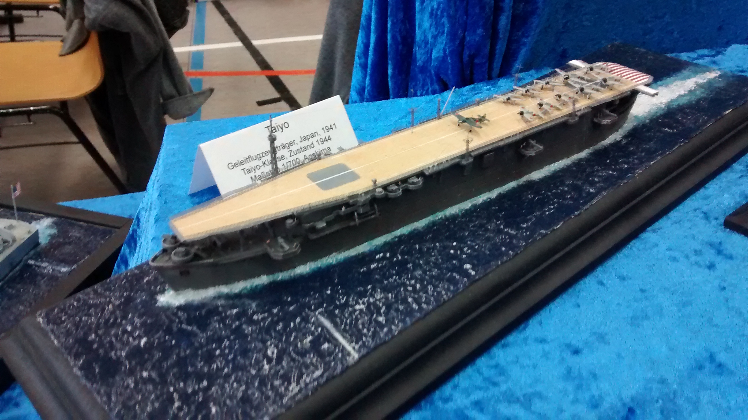 Direkt an unserem Nachbarstand gelegen, war mal wieder nicht hinreichend Gelegenheit, den Schiffsmodellen die ihnen gebührende Aufmerksamkeit zu widmen. Schon im letzten jahr hatte ich mein in mir aufkeimendes Interesse bemerkt – doch dann kamen die großen Spiele mit „Halvarson“ und „Doncolor“, die meine Aufmerksamkeit fesselten. Dieses Jahr tat der Zuspruch zu unserer Dioramenplatte Saint-Aubin-Sur-Mer ein Übriges. Dennoch sind mir die Modelle der IG Waterline aufgefallen. Die naturrealistische Darstellung der Wasseroberflächen, auch beim Kielwasser – von Farbe und Wellenausprägung her – faszinierten mich. Da ich bei Saint-Aubin viel mit Wasseroberflächen zu tun hatte, hätte ich gerne einige Objektstudien in Gelnhausen betrieben. Aber 2016 kommt bestimmt!