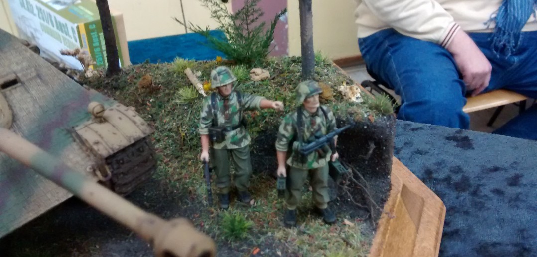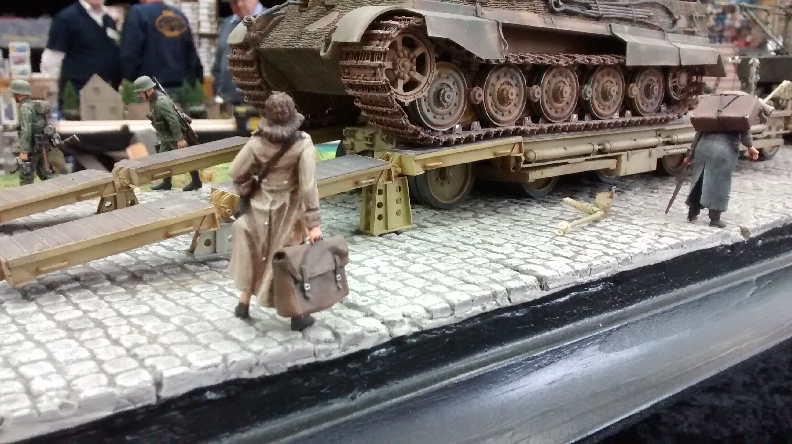 Ein weiteres Großdiorama lenkte meine Aufmerksamkeit auf sich. Auf einem Tieflader liegt ein Königstiger, die Mannschaften machen wohl gerade etwas Pause. Am Wegesrand ziehen Flüchtlinge vorbei, in einem winzigen Koffer ihr letztes Hab und Gut schleppend. Etwas bedrückt es mich schon und es lässt ein wenig die modellbauerische Leistung dahinter vergessen, so stark sind die Bilder. Wieder zurück im Hier und Jetzt kann ich mich an den Modellen erfreuen.