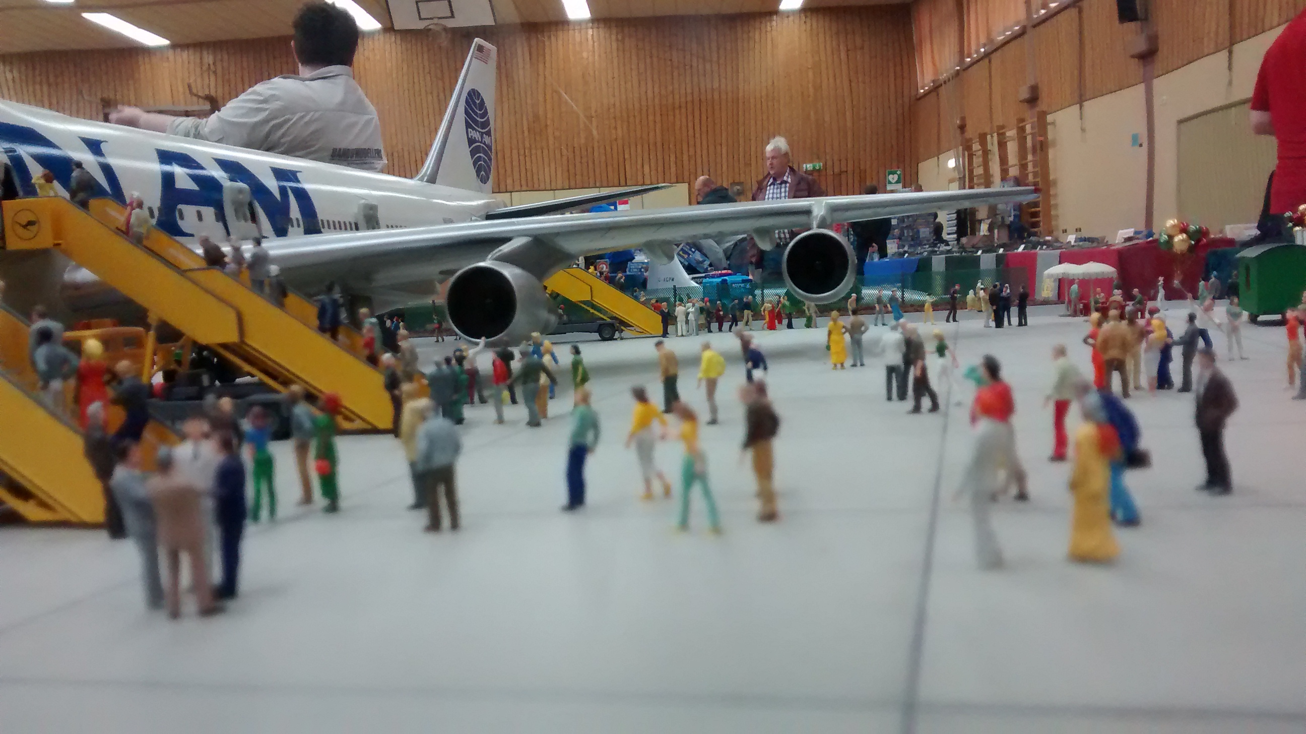 Gleich einen ganzen Flughafen mit Gangway, Passagieren, Flugfeld-Getümmel und mehr war unter einer Halbkugel aus Glas zu finden. Es müssen mehrere Hundert Preiserleins gewesen sein, die da rund um die Maschine standen.