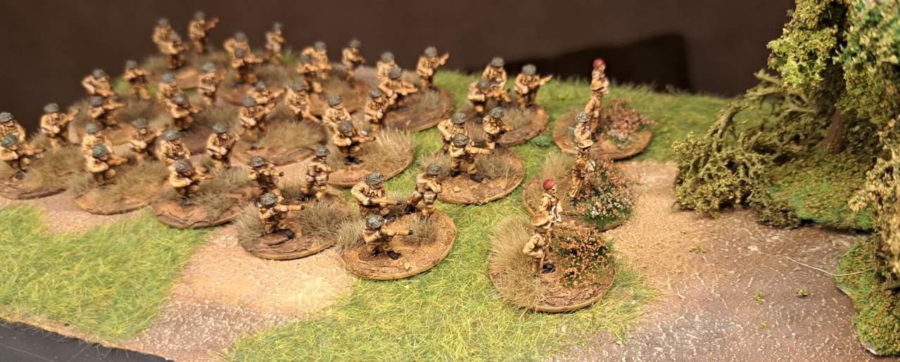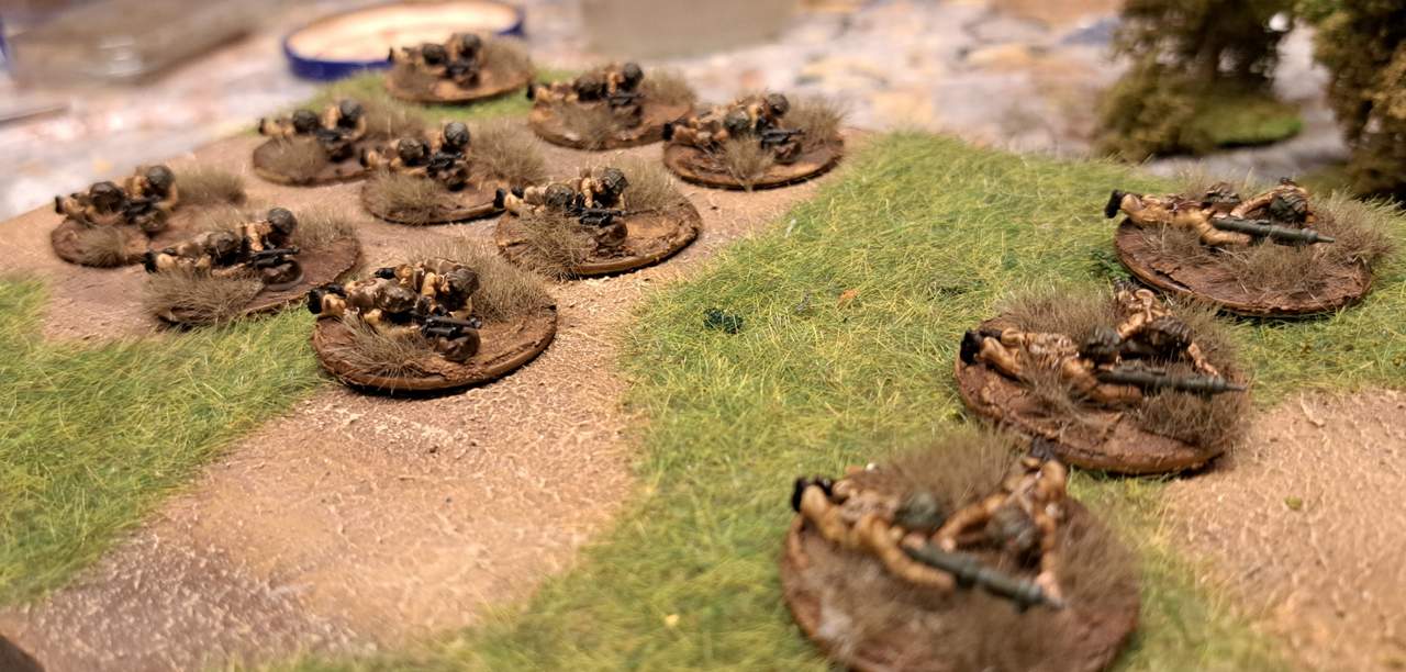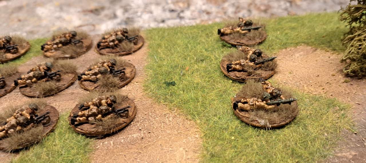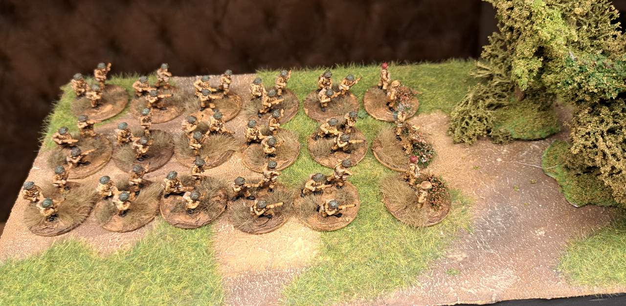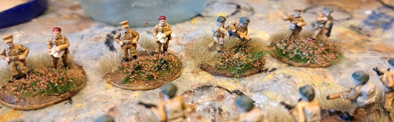 - Rifle Foot Groups sowie LMG / PIAT Teams erhalten ausschließlich bräunliches Gras in Form von Grasbüscheln von MiniNatur auf die Base. Das tarnt besser und es hebt sich so gegen die Offiziersbases ab.
