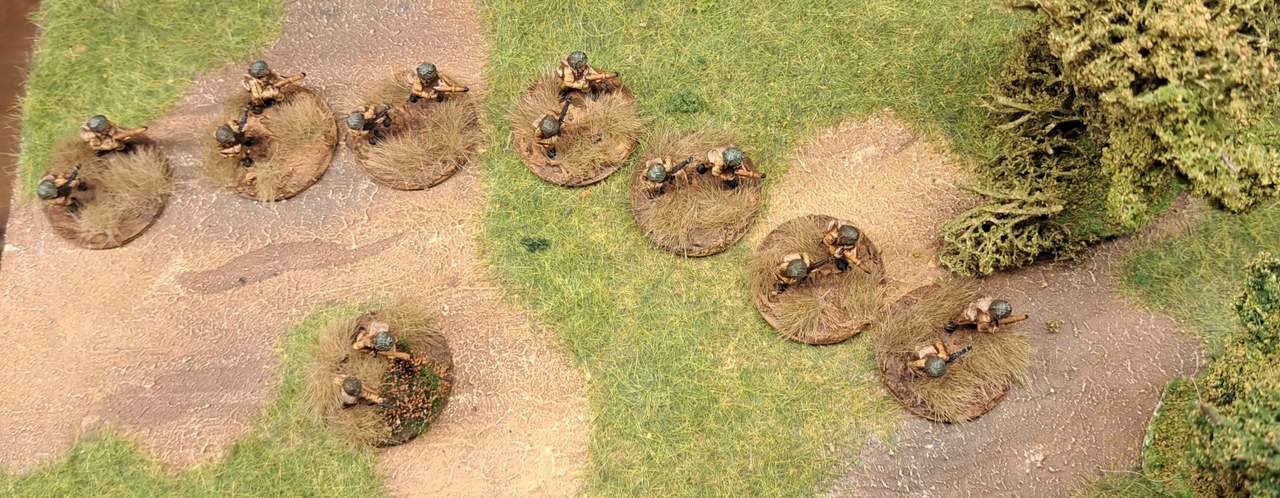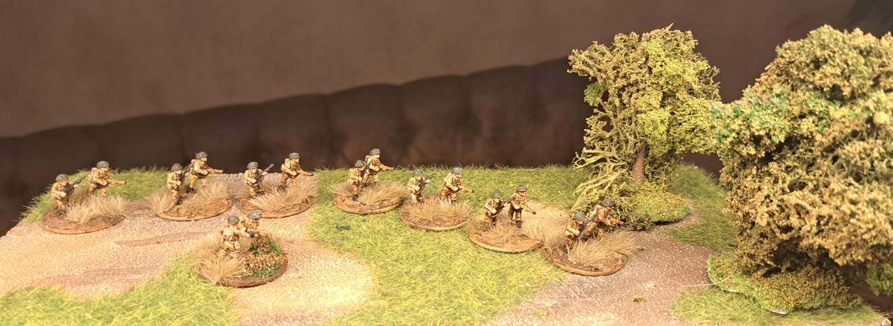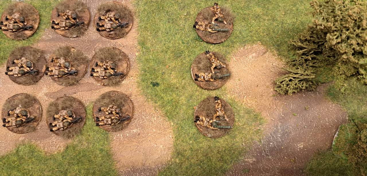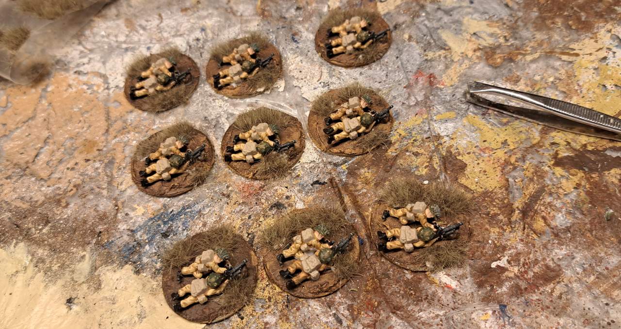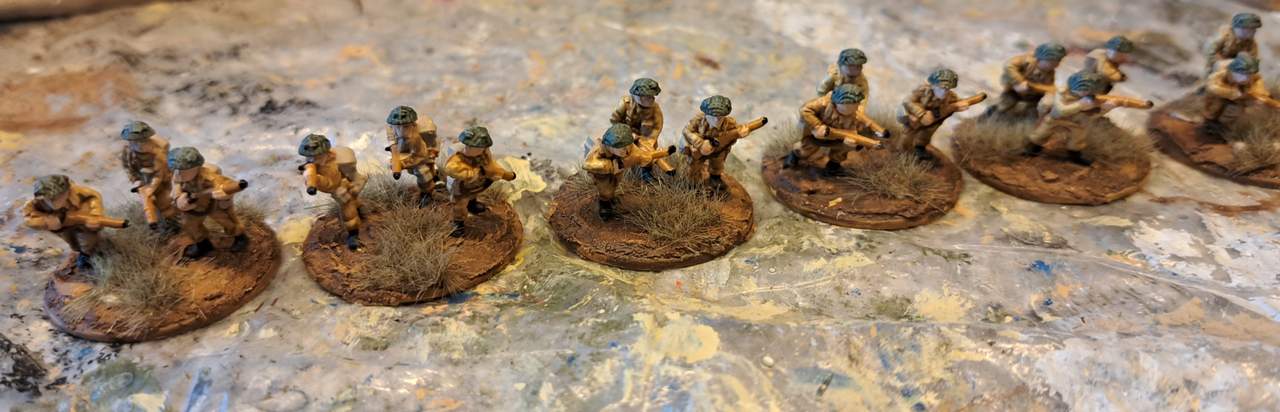 - Rifle Foot Groups sowie LMG / PIAT Teams erhalten ausschließlich bräunliches Gras in Form von Grasbüscheln von MiniNatur auf die Base. Das tarnt besser und es hebt sich so gegen die Offiziersbases ab.