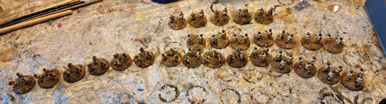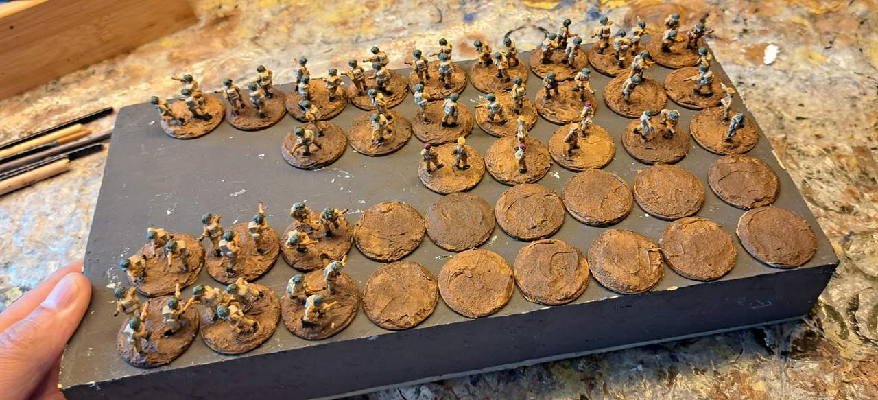 Die 90 Herren konnten nach dem Aushärten der Strukturpaste auf den Bases mit baldiger Auslieferung rechnen. Es stand ja auch nicht mehr viel an. Die Bases mussten bemalt und bepflanzt werden.