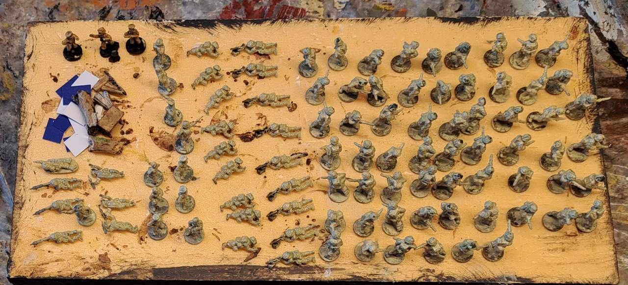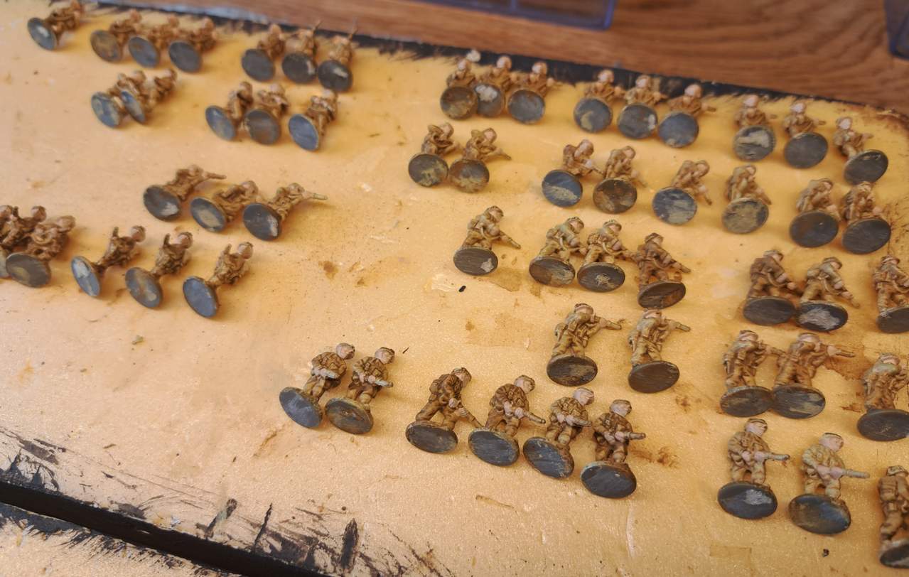 Die Figuren benötigten zuerst eine Grundierung, da sie als Zinnfiguren (die von PSC als Plastikminiaturen) völlig unbemalt waren. Hier wandte ich mein Standard-Verfahren für britische Truppen an. Etwas Erfahrung hatte ich ja bereits.