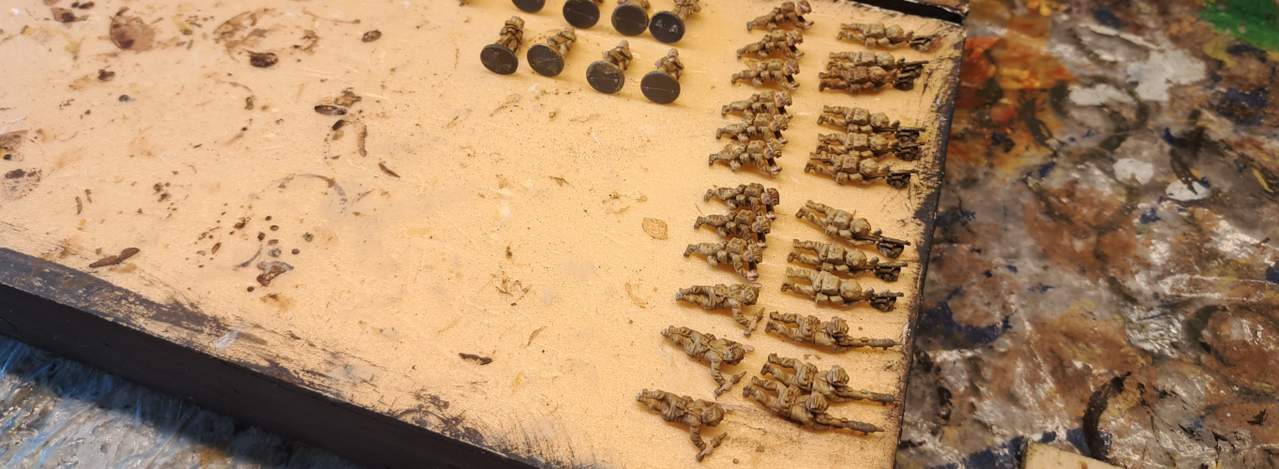 Dieses Mal kamen die Figuren größtenteils als unbemalte Zinnfiguren am Maltisch an. Ich konnte aus mehreren Loots Figuren zusammensuchen. Und dieses Mal stattete ich die Truppe mit mehr automatischen Waffen aus. Jedem Platoon stellte ich eine drei LMG Foot Groups bereit. Die LMG-Teams stammen aus dem Figurenset Heavy Weapons von PSC.