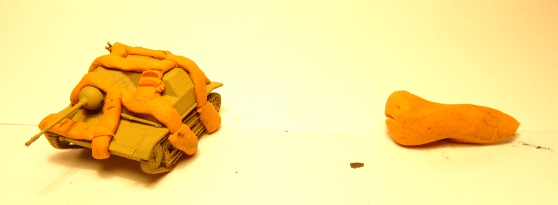 Bei der zweiten Farbe wird es tricky. Die zweite Farbe soll nur an ausgewählten Partien der Oberfläche aufgebracht werden. Hierzu wendet Jarno sein „Knetverfahren“ an. Er formt dünne Schnüre aus der Knetmasse und legt diese so auf die Oberfläche de Tankette auf, dass nur noch die gewünschten Flächen frei bleiben.