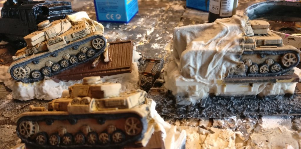 Die drei Panzer IV auf den umgestürzten Schwerlastwagen der Reichsbahn wirken von der Oberfläche her noch etwas ruppig. Nach dem Auftrag der „Dunkelgelb“ per Trockenbürsten war etwas mehr dunkle Struktur übrig geblieben, als ich es mir gewünscht habe. Da muss noch mehr „Dunkel“ weg und dafür mehr Dunkelgelb flächig drauf.