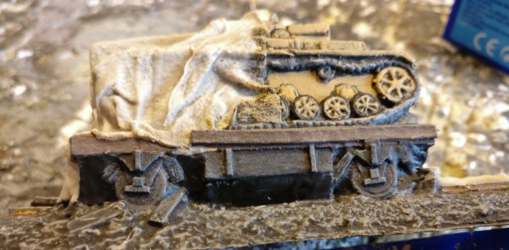 Die Panzer IV sind teilweise mit Planen bedeckt. Die Planen sind mit recht rauher Oberfläche aus dem Resin geformt bzw. herausgearbeitet worden. Das wirkt später natürlich sehr gut – wenn es denn fertig ist, das Teil. Bis dahin ist leider noch ein weiter Weg.