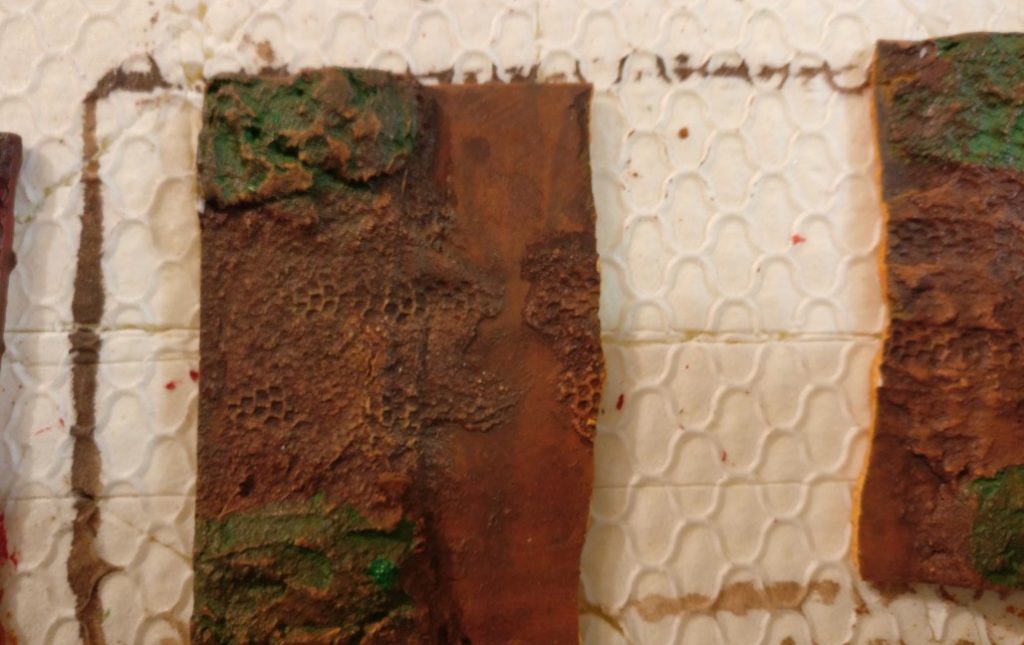 Der Auftrag der Farbe Lederbraun bewirkt eine Veränderung zum „Erdigen“ hin. Die betonung des Rotanteils ist nicht zu übersehen. Sehr eisenhaltig, dieses Erdreich.