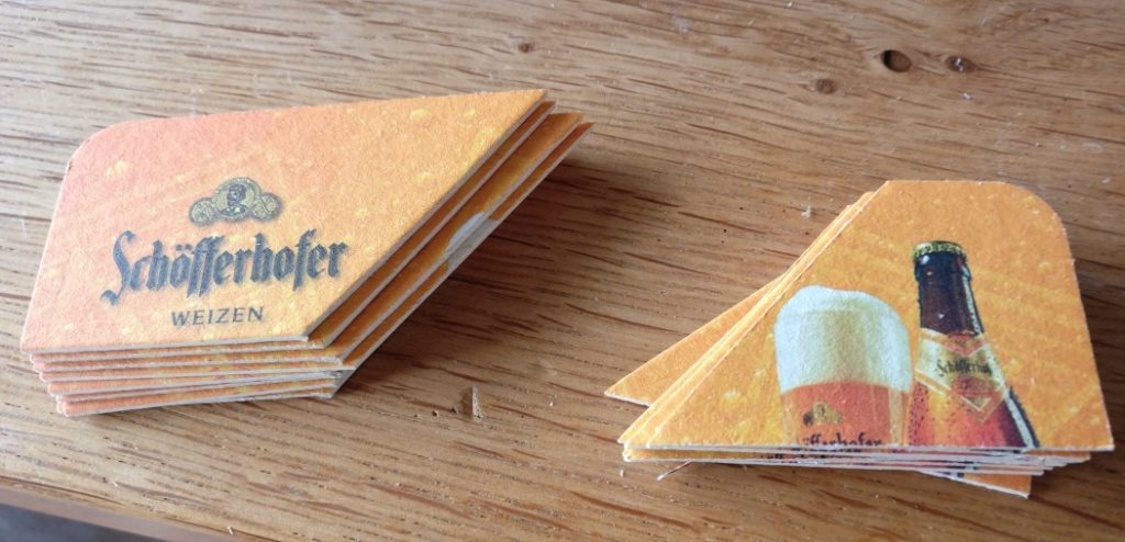Wie kriegt man den Bachlauf auf die Base? Der Gedanke, der mir kam, war einfach und schnell umsetzbar. Beim Schneiden der 5x5cm-Basen mit der Papierschneidemaschine bleibt immer viel Abschnitt über. Diese könnte man zum Unterfüttern der Ufer eines Bachbettes nehmen. Zwo Bierdeckelreste aufeinandergeklebt, etwas versetzt natürlich und man hat die Grundform eines Bachbettes.