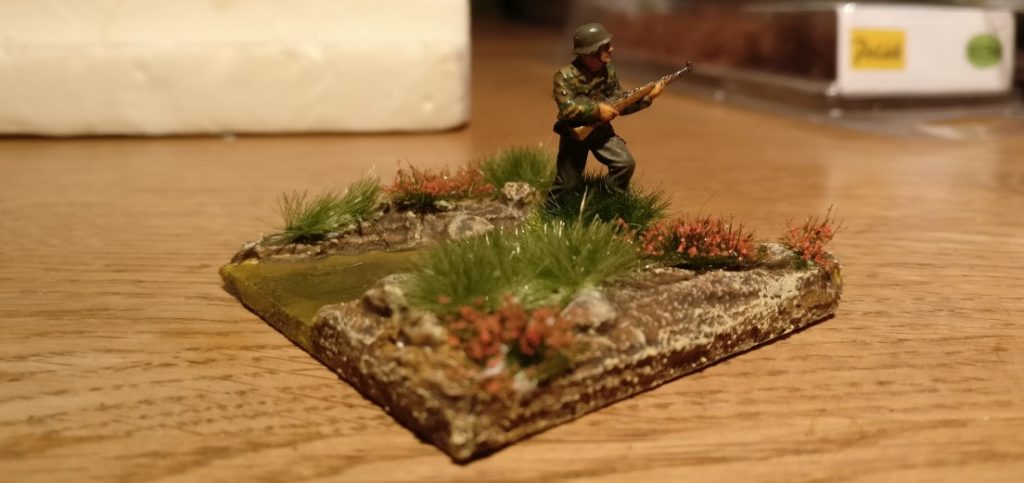 Kriegt der Sturmi von den Basen jetzt gar nicht genug? Nein, kriegt er nicht. Oder genauer: es kommen ihm Ideen auf Ideen. Diese hier zum Beispiel. Einen Bachlauf hatten wir ja schon bei den Vietnam-Basen und den Winterbasen für die Kradschützen. Beim Entwickeln der PBI-Basen für Saint-Aubin-Sur-Mer kam dem Sturmi die Idee für Basen, welche einen Ausschnitt aus dem Verlauf eines Bachs wiedergeben. SO als Variante. Acht Stück davon oder so und gut ist. Die kann man in der Normandie einsetzen, aber auch Early War in Holland oder Frankreich. Und in Russland genauso gut.