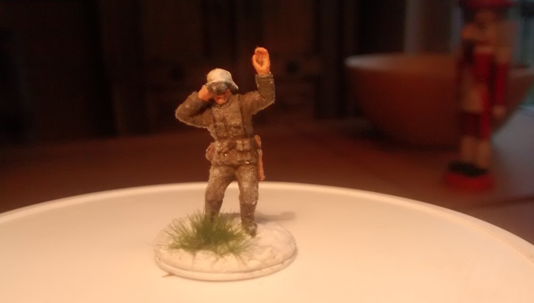 Der Artilleriebeobachter (aus dem Set „Deutsche Infanterie“ von MATCHBOX) mit Grasbüschel von MiniNatur und dem Pulverschnee von NOCH.