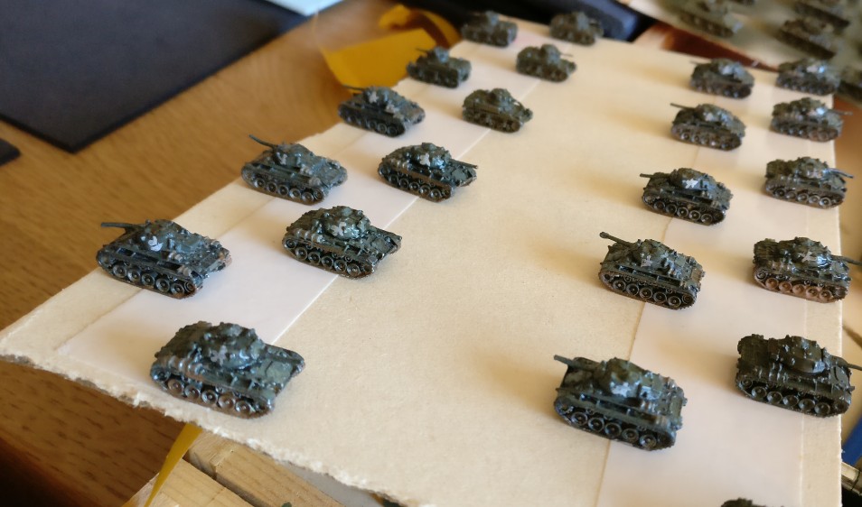 Bei den von uns bemalten Fahrzeugzahlen war das Abtrocknen eigentlich nie das Problem. Die GHQ-Mini-Armour Fahrzeuge hatten genug Zeit, die Farbe anzunehmen. 134 Modelle brauchen da schon etwas.