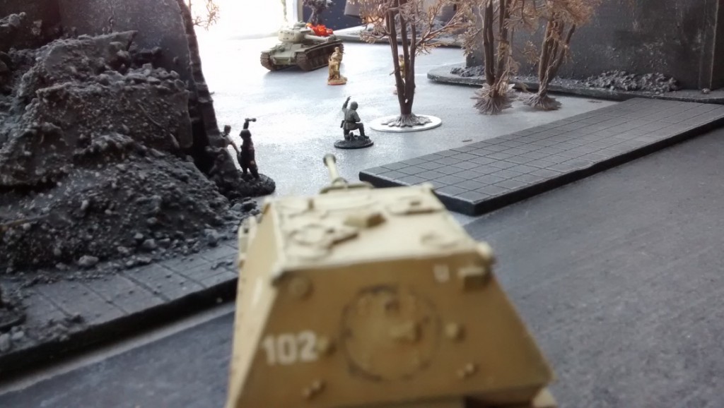 Die Rotarmisten in Plattenmitte erreichen die Gebäude an der Hauptstraße von der rückwärtigen Seite. Gleich wird man die Etagen besetzen um die Hauptstraße und die gegenüberliegenden Gebäude zu kontrollieren und von dort aus den Vormarsch von ISU 152 und T-34/85 zu unterstützen.