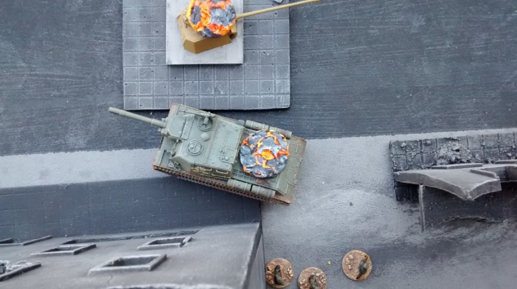 Nu aber. Zwei Granaten fliegen aufs ISU – schlagen aber keine Löcher. Das ISU ist oben zu dick gepanzert. Die Panzerfaust hämmert auf das ISU ein. Nix! Dann macht der Elefant seinen Job und verplättet dem ISU einen satten Volltreffer, dass es nur so kracht – und Ruhe gabs im Schacht.