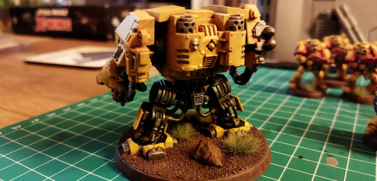 Wen wundert es, dass der Bestellonkel auch ein Faible für Warhammer und die Space Marines hat? Seine Imperial Fists könnten sich jedenfalls mit den Mechs anfreunden. Auf den nachfolgenden Bildern sind sie gerade auf dem Maltisch fertig geworden.