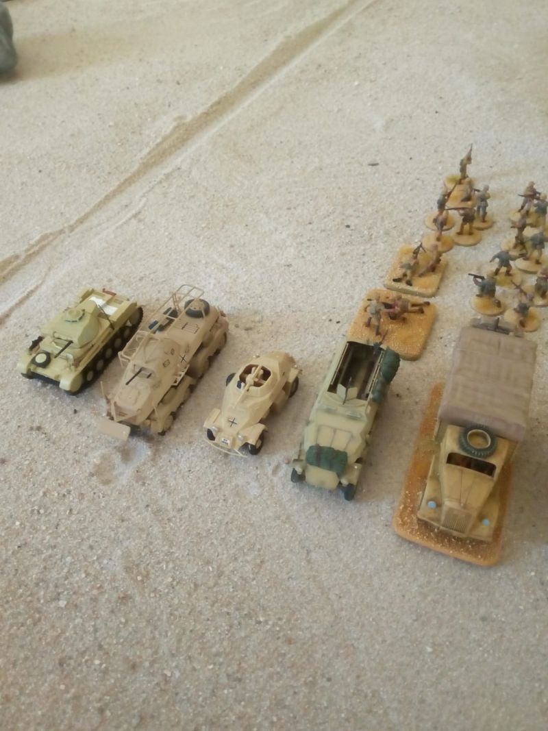 Rechts hinten schaut es fast wie eine LRDG aus. Hier setzen die deutschen Truppen des DAK grade zum Angriff auf den Vorposten der Briten an. Bolt Action at its best!