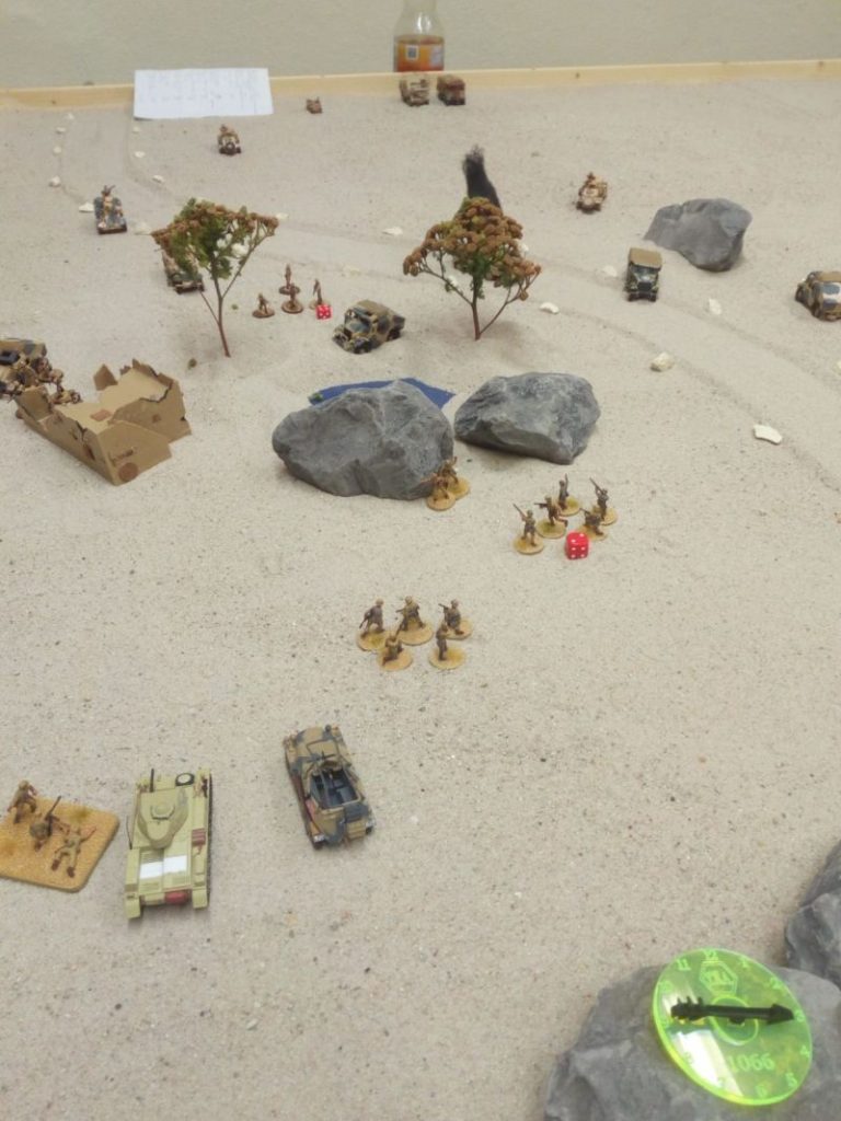 Bestellonkel aka Wheeling Turn hatte mit den Vereinsgenossen die Wüstenspielplatte rausgeholt und man hatte ein Stück vom Fuhrpark und ein paar Fußtruppen in die Wüste gescheucht. Wer Bolt Action kennt, der weiß, dass man da mit viel weniger Spielelementen auskommt. Demzufolge war es auch etwas luftiger aufe Spielplatte.