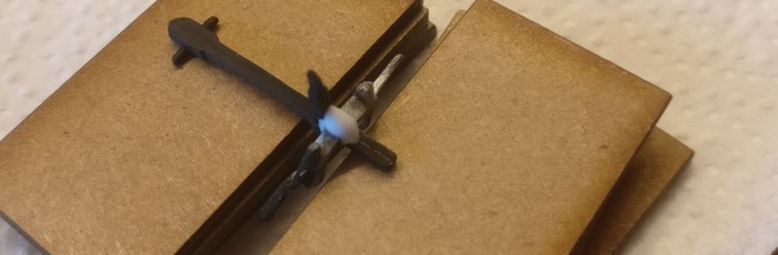 Den Anfang machte dann das Chassis des Pferdekarrens. Ich klebte die Räder auf die Achsen. Dann kam der Spannrahmen dran. Trickreich war das Aushärten des Klebers. Man muss das Ding geschickt arretieren, damit der PONAL in Ruhe seinen Job machen kann. Dann kam der Auslösehebel am Ende dran.