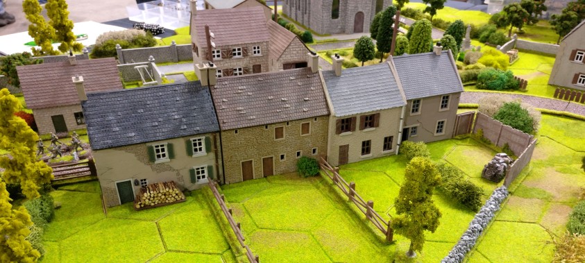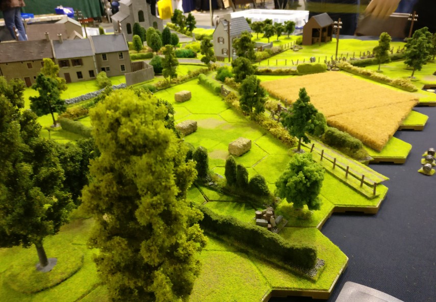 Eine weitere Spielplatte fiel mir auf. Die hier vorgestellte Spielplatte nutzt ein auf Hexagonen basierendes System von Geländeelementen. Es wirkt sehr aufgeräumt und flexibel. Was mir ebenfalls sehr gut gefällt, das sind die durchweg intakten Häuser auf der Spielplatte. Das wirkt doch angenehmer als eine Sammlung von Ruinen – wobei dies natürlich Geschmackssache ist.