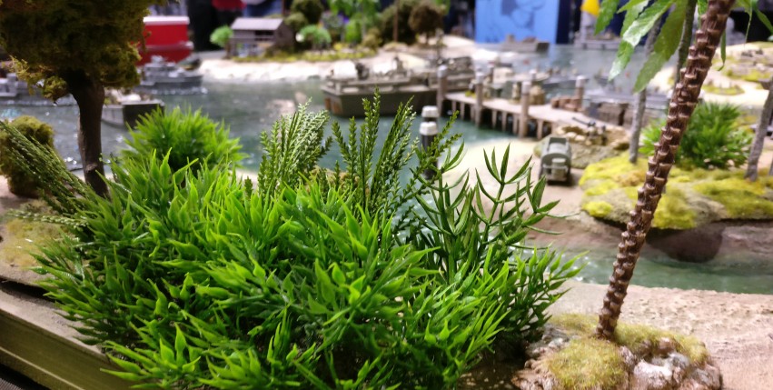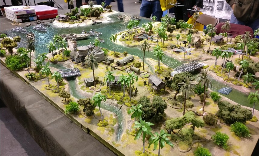 In der halben Bolt-Action-Größe gab es auf 180cm x 240cm eine beeindruckende Spielplatte zu sehen. Der Wasserfall mit Fluss zum Meer in Plattenmitte hat mich persönlich begeistert. Sowohl von der Gestaltung her als auch von den sich daraus ergebenden Spielmöglichkeiten.