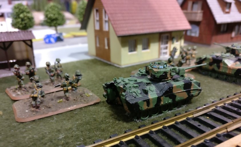 Diese Spielplatte wirkt wesentlich sauberer und aufgeräumter. Die Szenerie wirkt ruhiger, fast friedlich. Die belebenden Elemente sind Figuren und Fahrzeuge. Die Geländepartie am Fluss ist einfacher ausgestaltet, wohingegen die Gebäude feiner detailliert wirken.