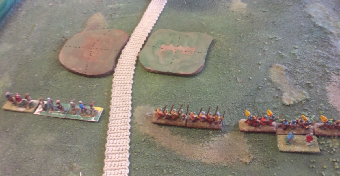 Die Aufstellung der DBA-Partie. XENA stellt im Bild oben den Deutschen Orden auf. Meinereiner unten die Schweden.