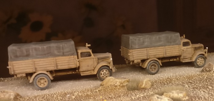 Das Afrikabraun ist getrocknet, Nun kam das Grüngrau auf die Planen der beiden DeAgostini Opel Blitz 3.6-36 S, Tunesien 1943