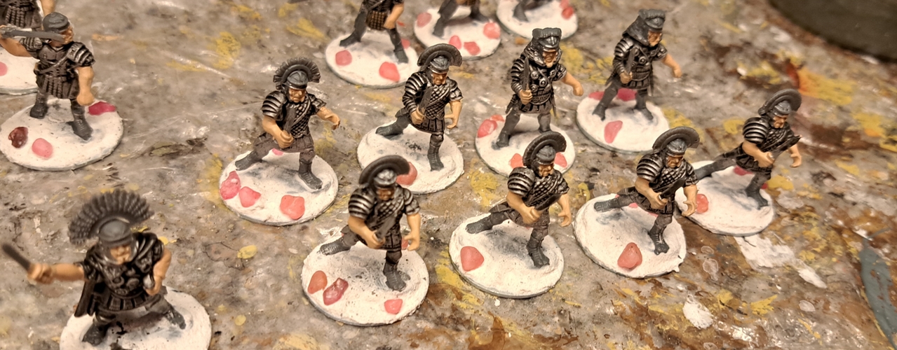 Die Frage ist berechtigt. Meist sieht man Römer in roter Tunika über den Spieltisch spazieren. Doch haben mich meine republikanischen Römer vom Aussehen her nachhaltig beeindruckt. Ich habe sie fertig bemalt bekommen und sie trugen eine blaue Tunika, die sich ausnehmend gut machte.