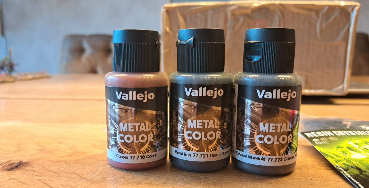 Stephan hatte eine Lieferung Necrons avisiert. Da herrschte natürlich Aufregung in der Unikornischen Bekleidungskammer. Es sollten ja „richtige“ Necrons werden. Solche mit bräunlicher Metalloberfläche. Das hatten wir noch nicht. Also hatte der Sturmi mal einen kleinen Farbvorrat geordert, um mit einer Varietät von Farbtönen dem Problem Herr zu werden.