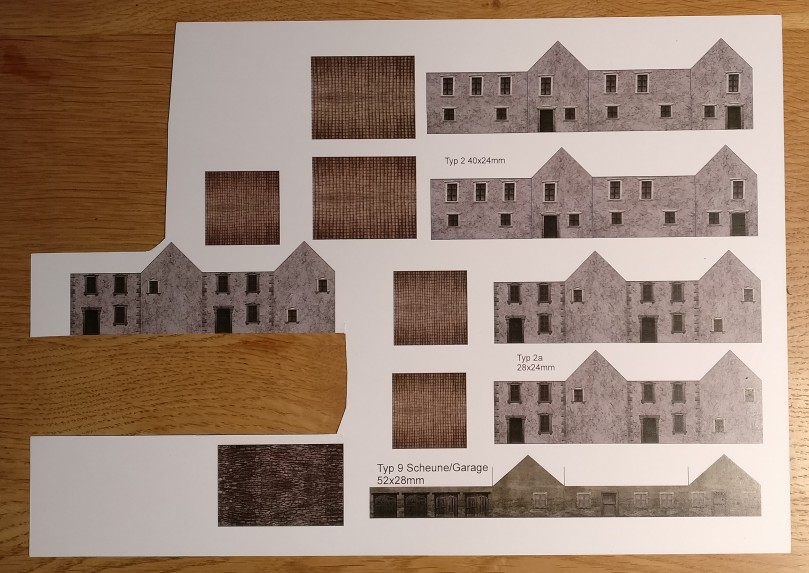 Als eines der Learnings aus dem 20mm-Scheldeprojekt nahm er auch die Anforderung mit, dass die Häuserwände an möglichst vielen Stellen bereits zusammengefügt sein sollten. So würde man in dem fitzeligen Maßstab nerviges Kleben nach Kräften vermeiden. Wie man auf den weiter unten abgebildeten Bastelbögen erkennen kann, werden alle vier Fassaden eines Hauses an einem Stück auf das Papier gebracht. So ist für die Fassaden nur eine einzige Klebestelle nötig.