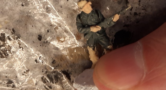 Die Schneebase ist sehr simpel. Ich grundiere weiß, lasse trocknen, trage dann mit Wasser verdünnten PONAL auf. Anschließend setze ich Grasbüschel von MiniNatur drauf. Dann streue ich Modellschnee von der Modellbahn drauf und lasse das Ganze trocknen.