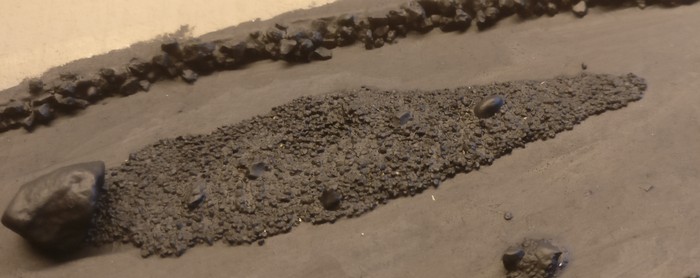 Der Vogelsand wird darüber geschüttet und in den PONAL eingedrückt. Die zuvor platzierten Steine bleiben so erhalten und ragen später aus dem Geröll auf.