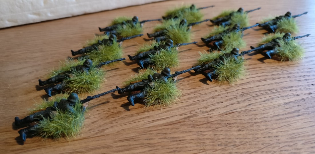 Wie schon bei den Offizieren, wurden auch bei den Mannschaften die basen fett mit PONAL eingesuppt und Mini plus Modellbahnstreugras ( Fa. NOCH, 6mm Länge ) aufgestreut. Auftrag von viel PONAL, viel Gras und festes Andrücken ist wichtig. Beim Trocknen zieht sich der Holzleim zusammen und zieht dabei die Halme des Grases an sich und in sich hinein. Dadurch richten die viele Halme auf, was direkt nach dem Auftrag des Grases noch ganz anders und vor allem ganz furchtbar aussieht. Hier noch ein Bild zu Beginn des Trocknungsvorgangs. Man erknnt, dass ich reichlich „Gras gegeben habe“.