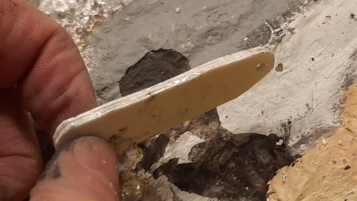 Es musste ja so kommen: als ich den Tisch abräumte, kullerte ein Pinsel in einen Schlitz zwischen zwei Farbtöpfe. Was lag dort? Richtig! Die vermisste Panzerkette…