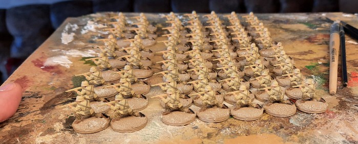 Auf das Malbrett sind sie schnell gestellt. Doch wenn man beginnt, die Horde zu bemalen, dann kann das schon etwas dauern, bis man Land sieht. Okay, den Landungstruppen geht das oft genauso, wenn sie im Landungsboot sitzen… Aber es ist schon nervig, wenn man z.B. das Webbing an den Figuren pinselt. Pro Figur braucht das so etwa 1,5 bis 2 Minuten. Nimmt man diese Zeitdauer mit 68 Figuren mal, kommt man rasch auf etwas über zwei Stunden. Und da ich einen aufzutragenden Farbton immer durchziehe und alle Figuren einer Pose in einem durchgängigen Batch beglücke, zieht dieser sich dann doch etwas in den Abend. Oder über den Tag. Man darf sich hier also in Geduld üben. Eine üble Disziplin, kann ich euch versichern!