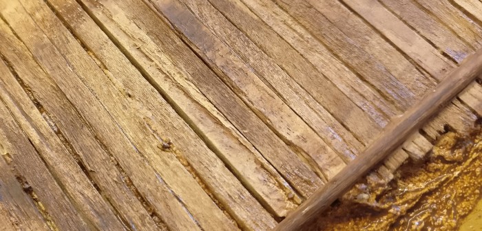Die Lasur wird in alle Strukturen und Ritzen des „Gebälks“ einziehen und den Kern des holzigen Aussehens bewirken.