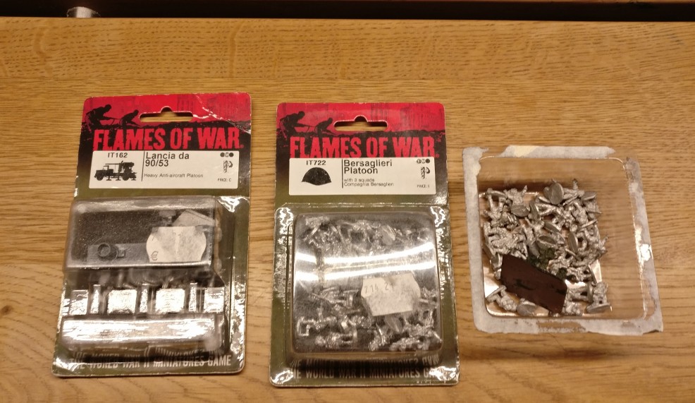 Von Flames Of War war eine Schachtel des Lancia mit Cannone da 90/53 und ein Bersaglieri Platoon dabei. Wenn die mal nicht nach Afrika gehen…