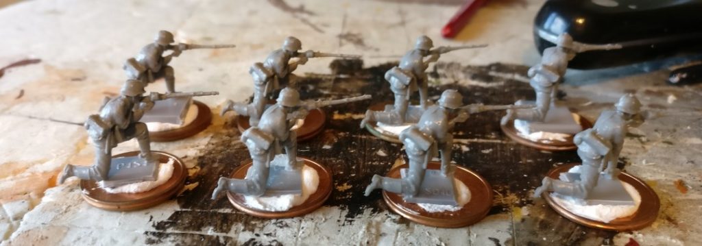 24 MG-Schützen aus dem Italeri Set 6068 German Elite Troops. Die Grundierung und der Auftrag der Basis-Farbe für die Uniformjacke erfolgte bereits.