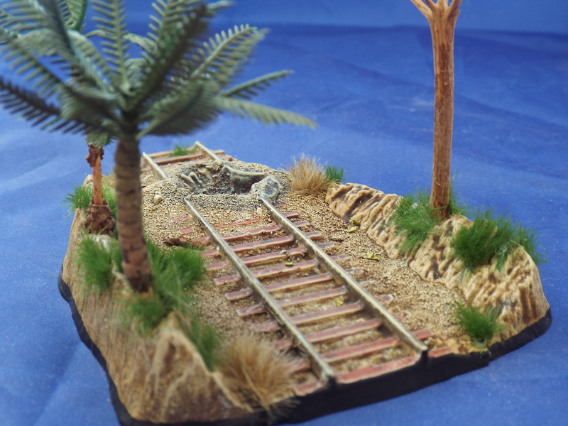 Die beiden Palmen machen deutlich mit welch geringen Mitteln unserer Phantasie Beine gemacht werden können. Den Bausatz hatte ich ursprünglich mal gedanklich nach Europa, genauer die Normandie oder nach Deutschland verfachtet. Diese beiden Palmen haben es geschafft, das Diorama alsogleich nach Italien zu beamen, wenn nicht sogar nach Nordafrika oder gar in den Pazifik. Einreizender Gedanke und schon entstehen vor meinem geistigen Auge die Bilder und beginnen zu laufen… Gerade rollt ein japanischer Zug über die Geleise und transportiert Chi-Ha Tanks an die Front. Ein Sturm biegt die Blätter der Palmen und droht, sie auszureißen. Regen peitscht gegen die Waggons des nächtlichen Zuges…