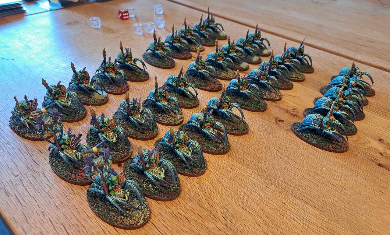Phantasievoll ist sie nicht, die Armee. Außer in der Bemalung. Ein sind berittene Goblins. Meist mit Speeren bewaffnet, nur wenige mit Schwertern. Und eine große Spinne ist auch dabei. Sie trägt eine Gerüst, auf welchem weitere Goblins herumturnen und sich in der Kriegskunst versuchen.
