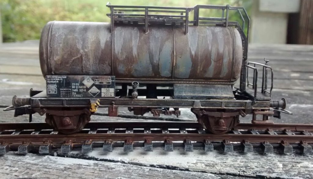 Die Alterung bescherte dem Kesselwagen Zcs von Roco reichlich Spuren. Wenn er in diesem Zustand auf der Modellbahn eingesetzt wird, könnte er glatt aus der damaligen Zeit stammen. Gut, die Anschriftentafel müsste noch etwas angepasst werden.