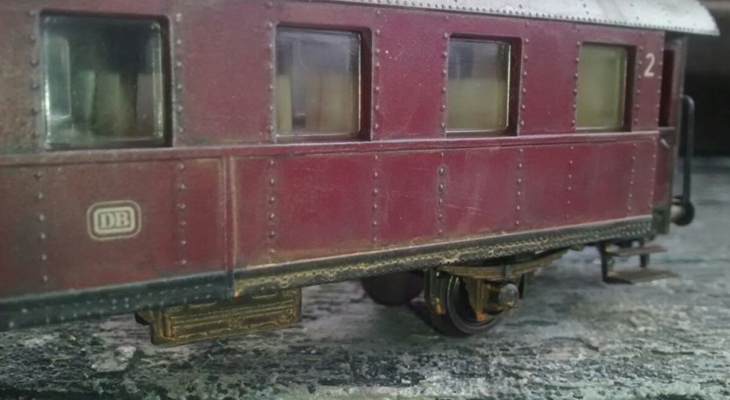 Dieser Vertreter hat in unserer Table-Top-Epoche Gilroys Hafen nie gesehen. Es ist ein moderneres Fahrzeug der DB, dessen Alterung Doncolor sich hier vorgenommen hat. Die Fotos zeigen deutlich, dass die Alterung hier das Auftragen vieler Farbschichten erforderte. Auch hier wurden nur Revell Aquacolor Farben verwendet.