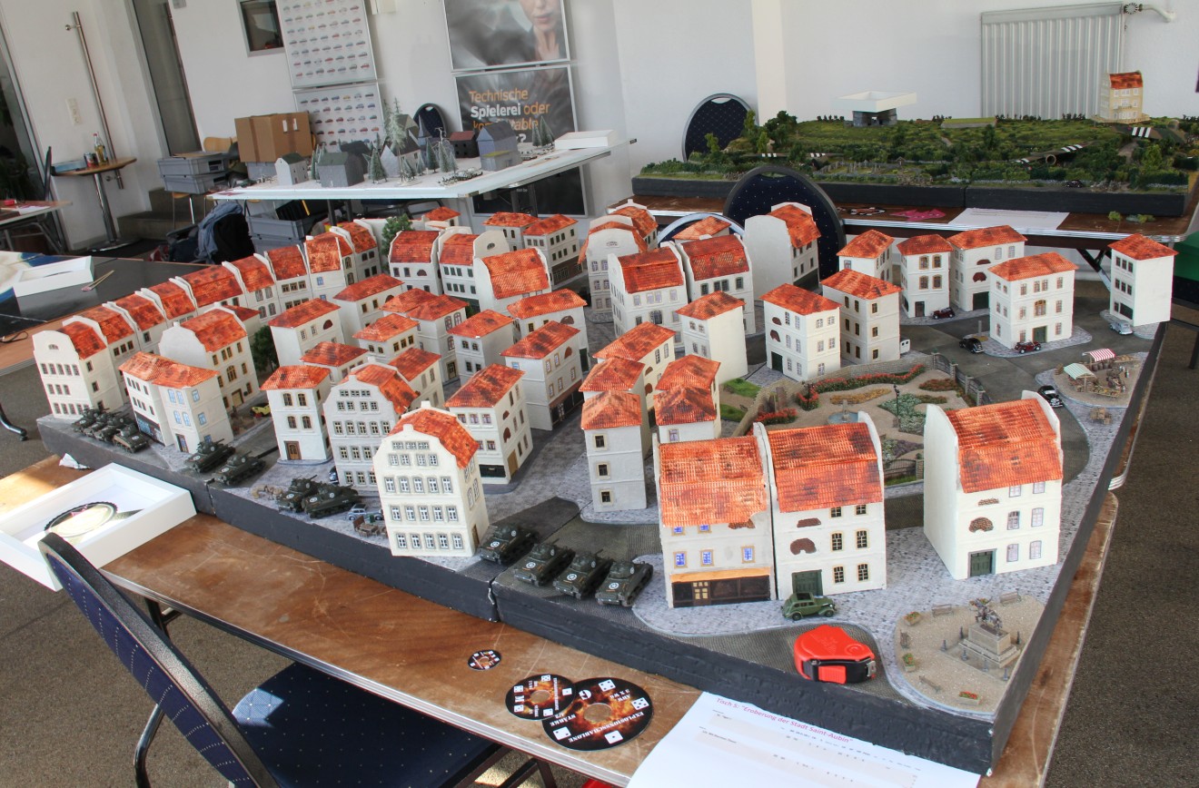 Unser fünfter Table-Top-Spieltisch greift das Thema „Panzergefecht innerorts“ auf. In unserer Modellstadt „Saint-Aubin-Sur-Mer“ tummeln sich die Gefechtsfahrzeuge der beiden Spieler. Ohne Infanterie ist dieses Game-Format sehr schnell und kurzweilig. Das oben stehende Video zeigt die Platte und manches Detail. Auch die Armeen werden gefeatured.