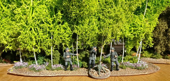 Der erste Trupp vom Panzergrenadierbataillon war jetzt recht schnell fertig. Nachfolgend seht ihr die Herren mit der frisch ausgeteilten Uniform vor den erst kürzlich geschaffenen Wald-Auflegern. Man sieht, die Waldstücke können auch glaubhaft in einer 20mm-Battle eingesetzt werden. Fein…