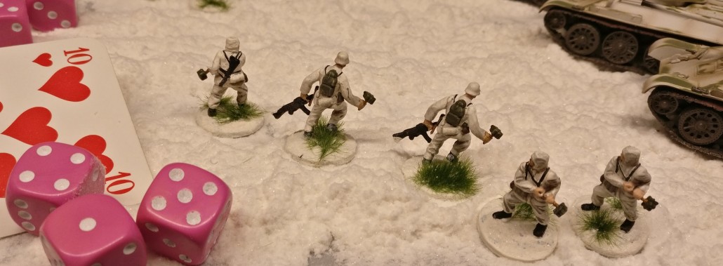 Mitunter müssen Infanterieeinheiten direkt gegen gepanzerte Fahrzeuge, Panzer, Unterstände und Bunker vorgehen. Das Vorgehen und der Angriff auf derartige Ziele erfordert Mut und Können – oder zwo Tabletten Pervitin! Insofern wird der Kartenwert der Kommandokarte beim Befehlstest um +2 erhöht. Tschacka!