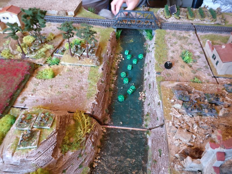Der Panzerangriff der US-Truppen reicht bis kurz vor die Stellung am Ortsausgang hinter dem Fluss. Sofort eröffnen die Shermans das Feuer aus allen Rohren. Es ist nur dem Würfelglück des Herrn Rittmeister zu verdanken, dass nicht Schlimmeres passiert.