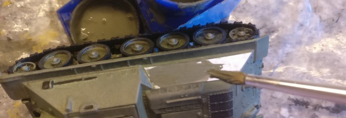 - Die Panzerketten werden mit Revell Aquacolor Mittelgrau trockengebürstet. So wirken die erhabenen Stellen der Ketten als helle, blanke Metallstellen, die aus der Verschmutzung der Ketten herausragen.
