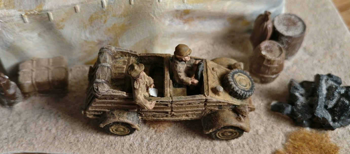 Der VW Typ 82 Kübelwagen war ja anfangs auch ein wenig schwarz. Auch hier ging ich wie beim Panzer III vor. Er wurde mit Ocker trockengebürstet und „plöpp“ war er auf einmal schick und mit Gebrauchsspuren ausgestattet. Die Reifen der fünf Räder malte ich schwarz, ebenso das Lenkrad. Später beim Trockenbürsten mit der 36184 Beige blühten die förmlich auf.