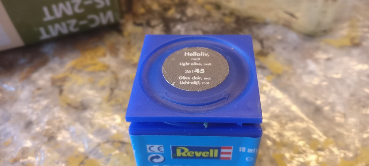 Revell Aquacolor Helloliv. Meine am häufigsten verwendete Farbe für das Trockenbürsten von Fahrzeugen in Grüntönen.